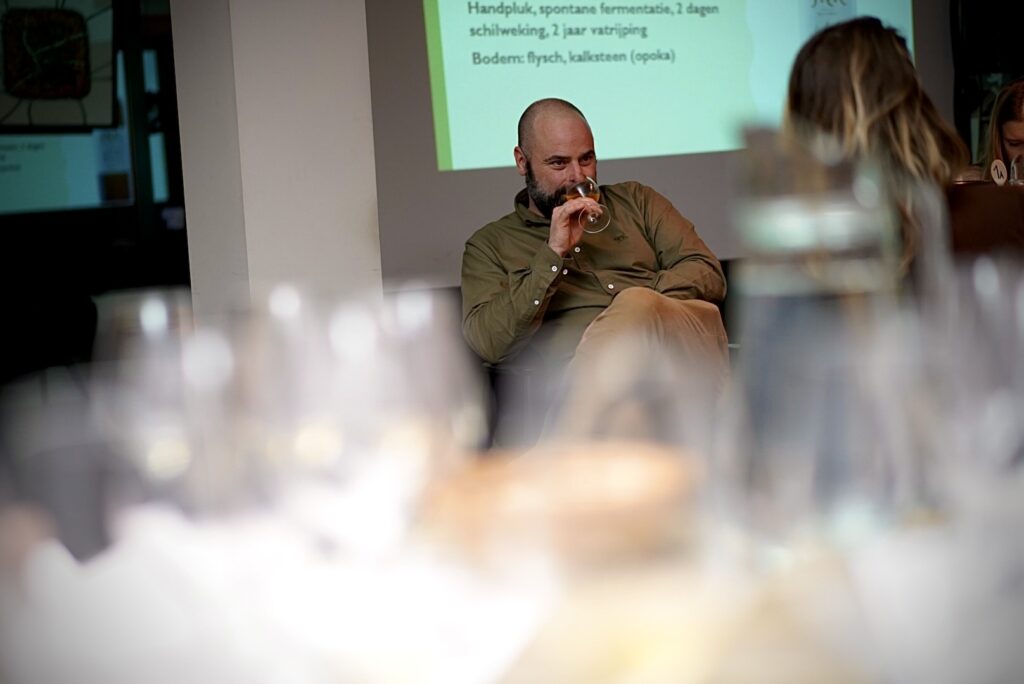 Lander Van Hoye zei het ergens, in zijn inleiding. “Natuurwijn is alles loslaten wat je denkt van wijn te kennen.” Ik knikte wel, maar ik begreep eigenlijk niet waar hij op doelde. Fast forward naar wijn vijf. Sauvignon Blanc. Mooi glas wijn. Geen: buxus, gemaaid gras, ‘pipi de chat’. Wel: fijn en delicaat, meloen, passievrucht, abrikoos. Lander zei het nog eens: deze wijn om aan te tonen dat je moet loslaten wat je denkt te kennen. En toen klopte het plaatje ineens. Ik snapte het. Het was de eyeopener van de avond.