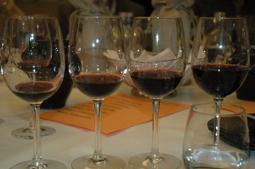 De wijnen worden per twee blind geschonken en om beurten beschrijft een tafel de wijnen. De laatste wijn wordt alleen geschonken. Dit is de gebruikelijke manier op onze degustatie avonden.